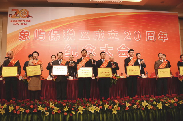 11月28日上午,在慶祝廈門象嶼保稅區(qū)成立20周年的喜慶日子里,廈門市委、市政府隆重舉行慶祝大會(huì),回顧保稅區(qū)20年的奮斗歷程,總結(jié)保稅區(qū)20年的發(fā)展經(jīng)驗(yàn),展望保稅區(qū)更加美好的發(fā)展未來。為保稅區(qū)建設(shè)立下汗馬功勞的10家突出貢獻(xiàn)企業(yè)和10位突出貢獻(xiàn)個(gè)人受到了隆重表彰。其中,廈門象嶼集團(tuán)有限公司、廈門象嶼股份有限公司榮獲突出貢獻(xiàn)企業(yè),象嶼集團(tuán)黨委書記、董事長(zhǎng)王龍雛,象嶼建設(shè)集團(tuán)常務(wù)副總經(jīng)理王澍陶榮獲突出貢獻(xiàn)個(gè)人。