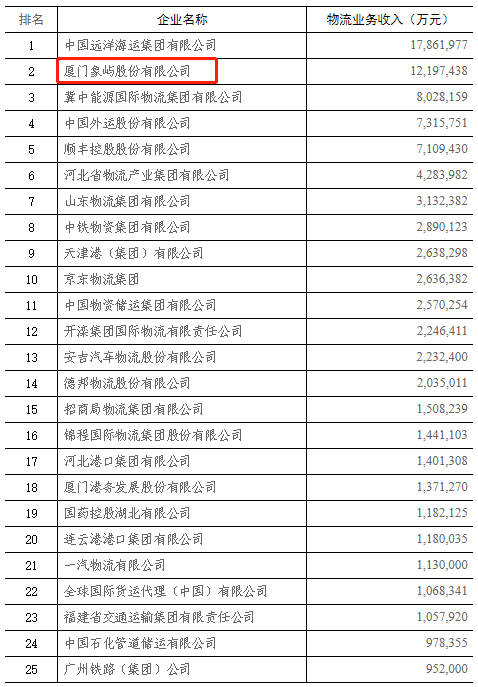 11月23日,中國物流與采購聯(lián)合會公布了2018年度中國物流企業(yè)50強(qiáng)排名,象嶼股份位列第2,較上一年前進(jìn)兩位。
