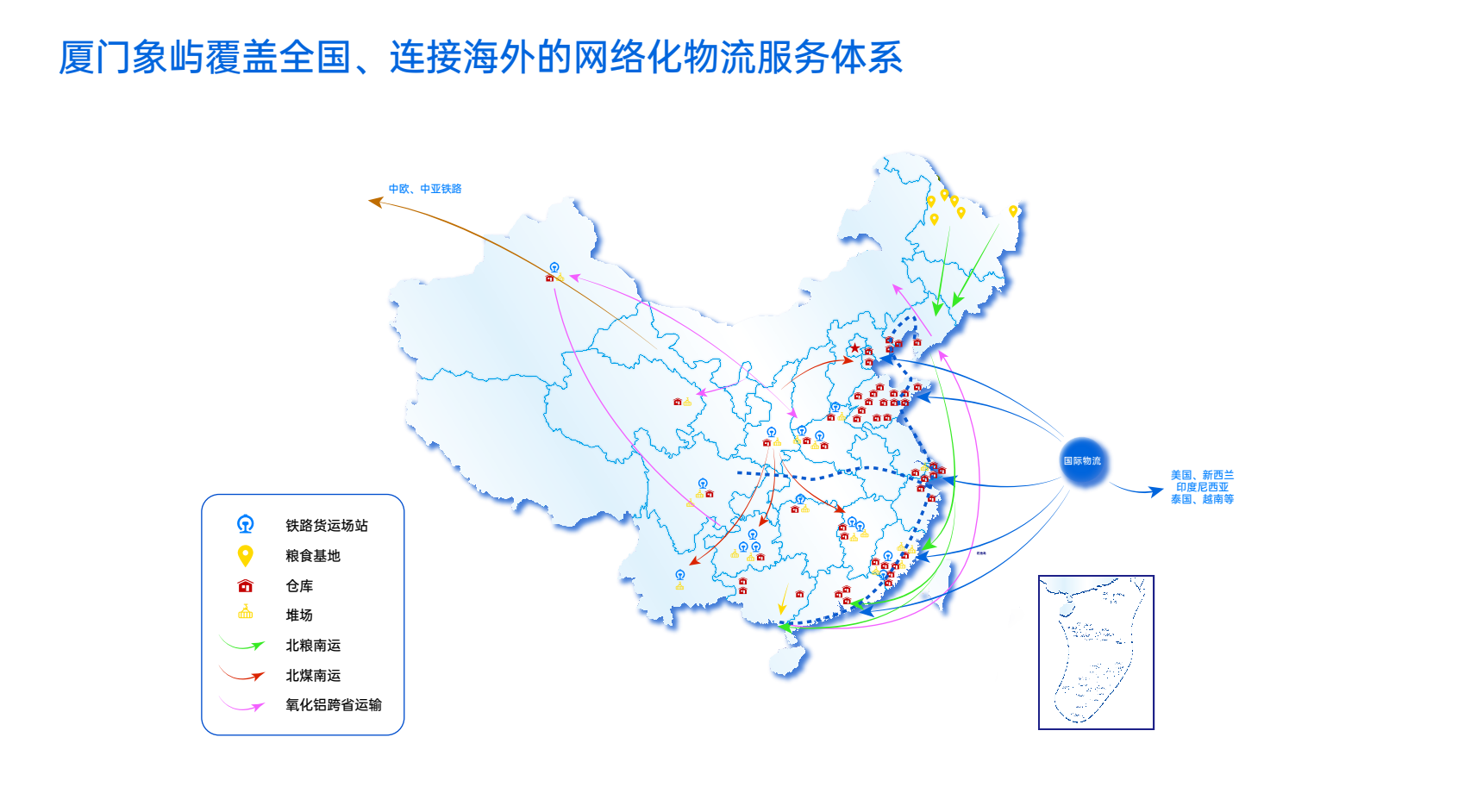 象嶼股份立足于實(shí)現產(chǎn)業(yè)鏈供應鏈安全穩定、構建新發(fā)展格局的需要,著(zhù)力解決大宗商品物流成本高、效率低的難點(diǎn)痛點(diǎn),在業(yè)內率先成功構建“鐵水聯(lián)運,公路短倒,倉儲配套”多式聯(lián)運物流骨干網(wǎng)絡(luò ),打造覆蓋全國、連接海外的網(wǎng)絡(luò )化、智能化物流服務(wù)體系,形成網(wǎng)絡(luò )化、國際化、產(chǎn)業(yè)化、平臺化、綠色化的物流產(chǎn)業(yè)格局,促進(jìn)全產(chǎn)業(yè)鏈上各環(huán)節的降本增效、綠色環(huán)保、高效發(fā)展和技術(shù)創(chuàng )新。