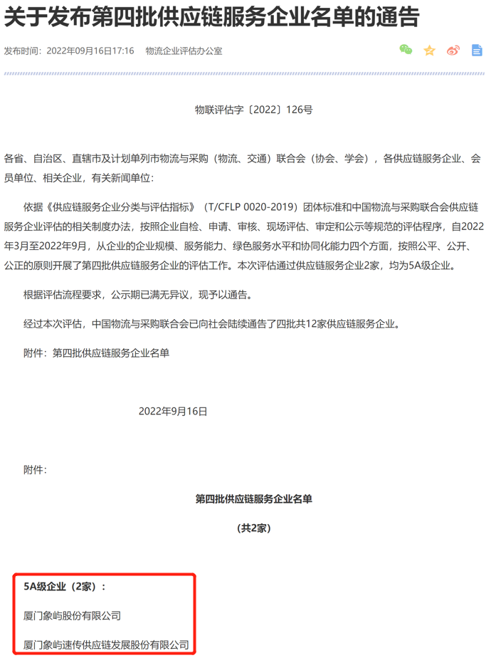 最高等級!象嶼股份及旗下象嶼速傳通過(guò)“5A級供應鏈服務(wù)企業(yè)”評估
